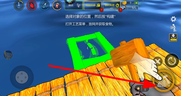 2、选择对象的位置,然后按构建键,打开工艺菜单,放置物品,比如放网,以此获取食物等资源。