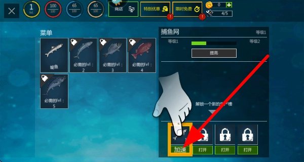 3、对捕鱼网进行捕鱼加速操作,提升捕鱼网的捕获鱼的速度,增强其功能,能更高效地捕鱼,获取更多鱼类资源。