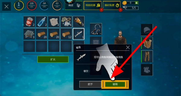 4、在物品栏中选择捕获的鱼,点击使用,可利用鱼来恢复状态或进行其他操作,保障生存需求。