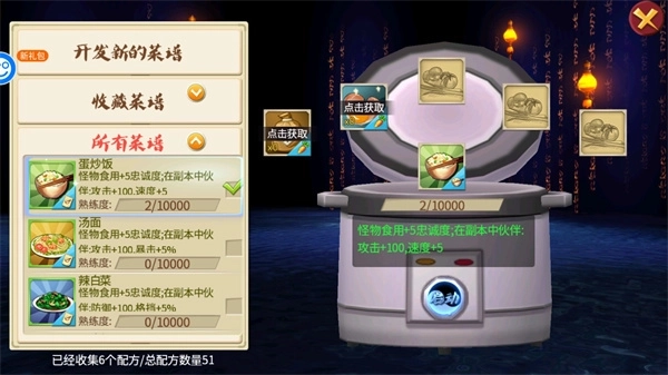 玩家在庄园中获得的食材,可以根据已知的菜谱制作成菜品。根据食材随机发挥的话也可能获得意想不到的而惊喜哦~菜品可在战斗中使用以增加战斗属性,也可以投喂给怪兽或赠送给NPC。当NPC的好感度到达一定程度时,玩家便可以获得NPC的卡牌碎片,碎片收集完全便可以召唤该NPC了。在游戏当中,可供玩家提升好感度的npc共有二葫、姜子牙、女王大人、太一真人四位,其中不仅有妖娆多姿的御姐,还有可爱激萌的萝莉……还在等什么?!幼女即是正义啊诸君!