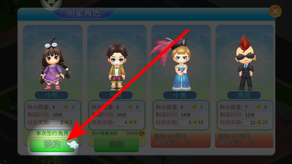 4、合理签约明星,选择可免费签约的明星,签约后明星到店可吸引更多顾客,增加超市人气,提升经营效益。