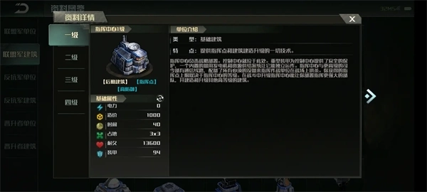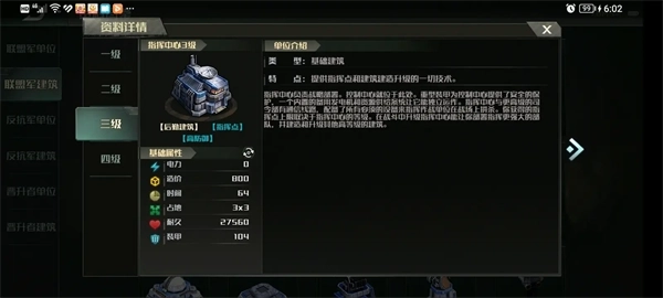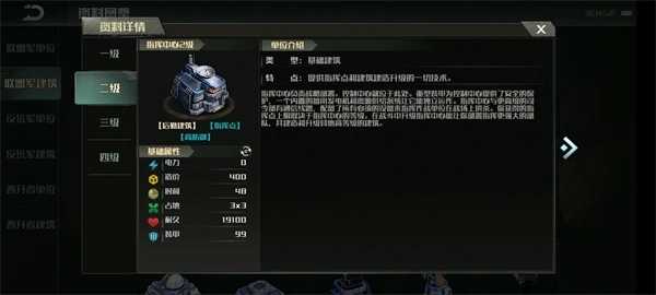 其他建筑生命值普遍偏少的反抗军都指挥中心却在1到3本比其他两个阵营要多,分别为:1本19100血,94甲、2本24600血,99甲、3本29860血,104甲