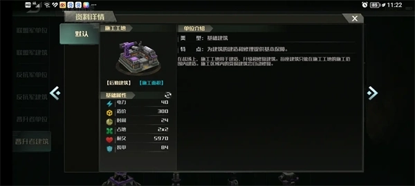 解锁建筑:施工工地上限2,突击车工厂上限2,特种车工厂上限2,空军工厂上限2,船坞上限2,基础防御塔上限3,炮塔上限2,防空塔上限4,海上防御塔上限3