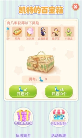6、若想开启百宝箱,可使用专属道具月亮石。每次开启一个宝箱需消耗1个月亮石,也能用8个月亮石一次性开启十个宝箱。开启宝箱后,有机会随机获得熊熊乐园相关物品、玩偶公仔、食物以及金币等。