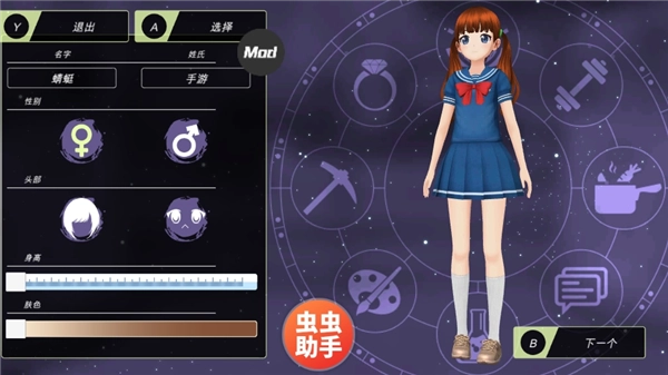 外貌调整:支持发型、瞳色、身高、体型等20+项参数调节,可导入自定义头像。