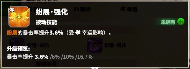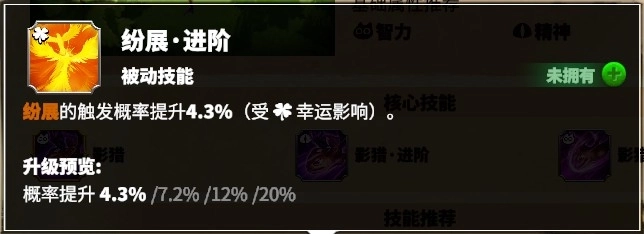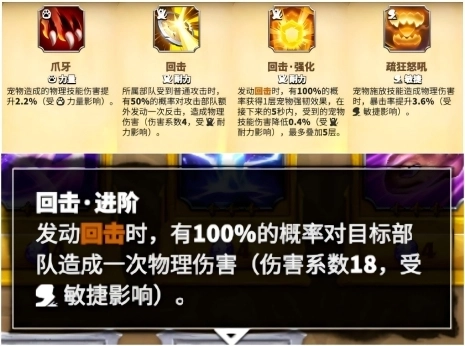 至于其它的技能,则选择以增加伤害为主的搭配,建议选择:“纷展”、“纷展·进阶”、“纷展·强化”、“共鸣”、“幸运法球”这几个技能,可以让宠物释放怒气技能时有概率额外产生伤害,并提升宠物攻击的伤害值和暴击率。